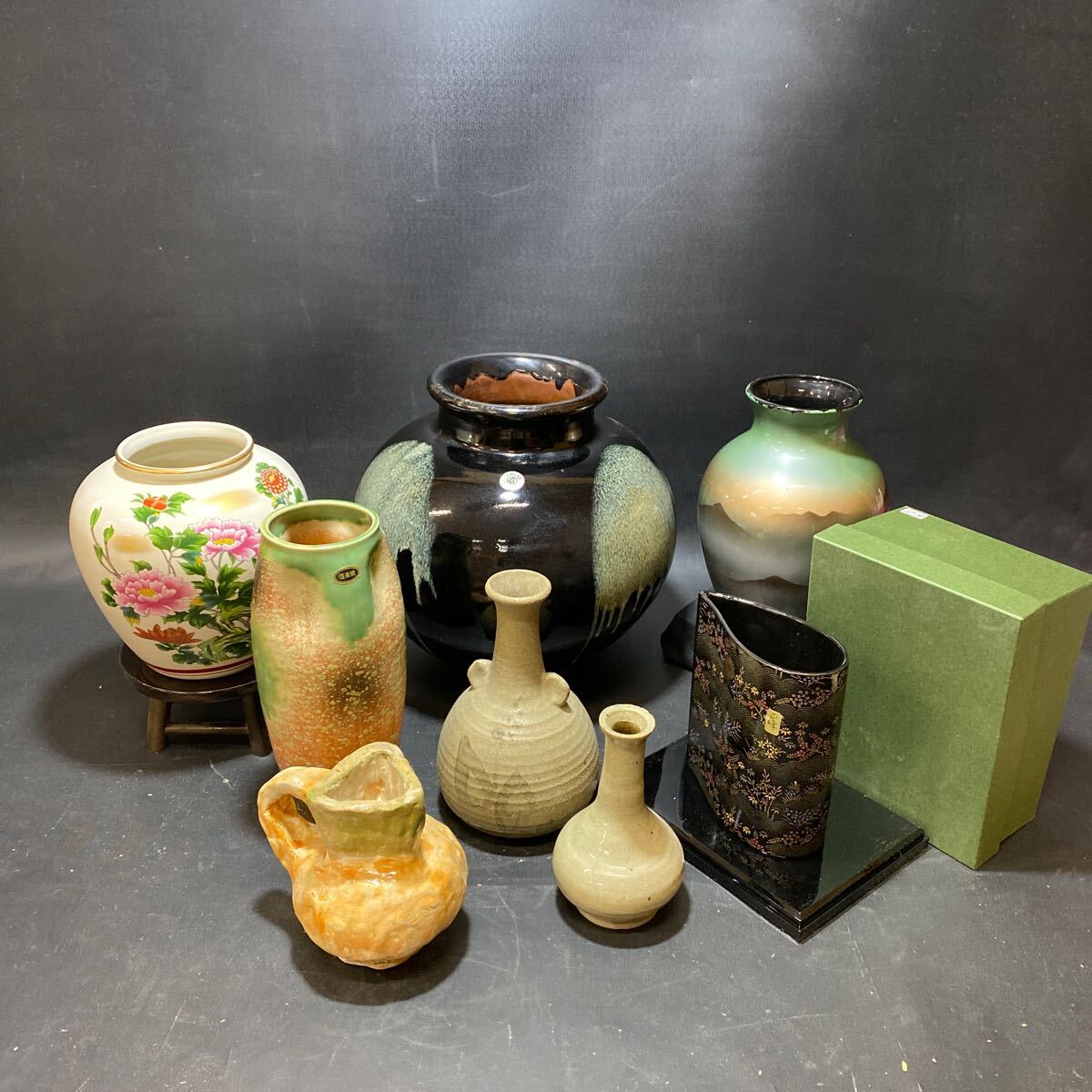 > N 5745 [ 花器 8点 まとめて ] 焼物 巨峰 美濃焼 辰己窯 信楽焼 壺 華道 花生け 花入れ 花活け 茶道具 花瓶 箱入り 新品 中古 現状品
