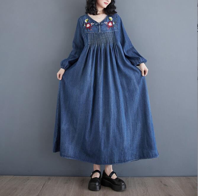 > 新入荷デニム ワンピース 長袖 カジュアル 刺繍り デニムワンピース ミモレ丈 ゆったり 体型カバー ロングワンピース おしゃれ L
