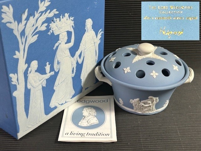 - ◎ウェッジウッド ジャスパー 白い両耳 蓋物 ポプリポット「ウェッジウッド卿のコレクション」◎箱付z76