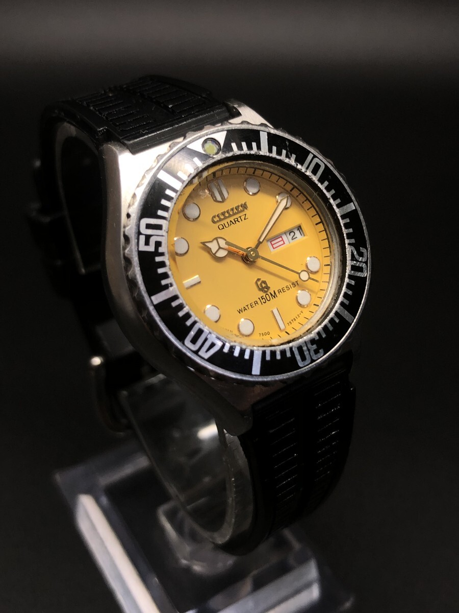 > 希少◆シチズン【ダイバー/イエローダイヤル】ボーイズ/レディス◆当時物CITIZENダイバーベルト◆新品電池交換済◆回転ベゼル(動作確認済)