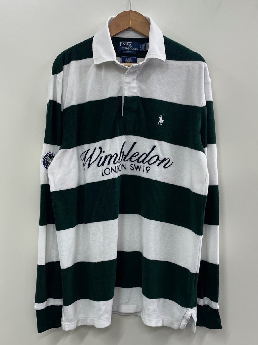 > ■POLO RalphLauren ポロ ラルフローレン ラグビーシャツ 長袖 パイル地 ボーダー ウィンブルドン ラガーシャツ 170/92A 中古□■
