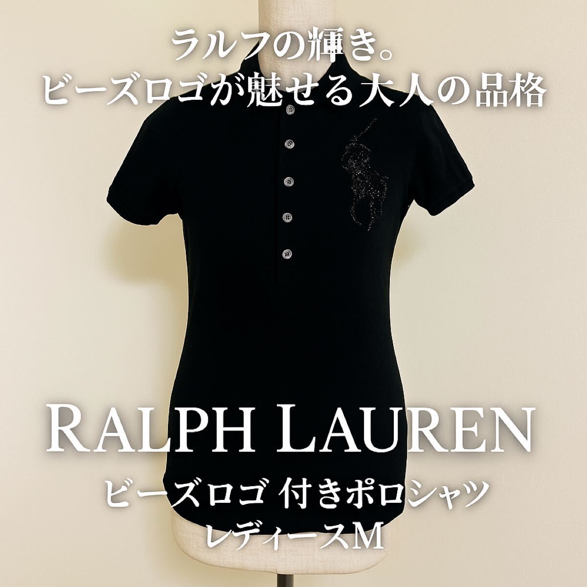 - ラルフローレン レディース 黒 ポロシャツ M ビーズロゴ ワンポイント刺繍