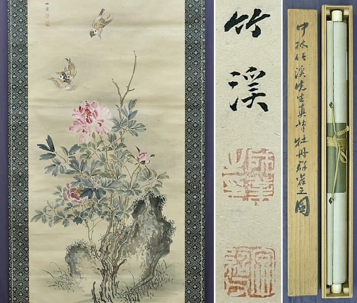 - 【真作】 中林竹渓 『牡丹に戯れ雀之図』 掛軸 保存箱 no10