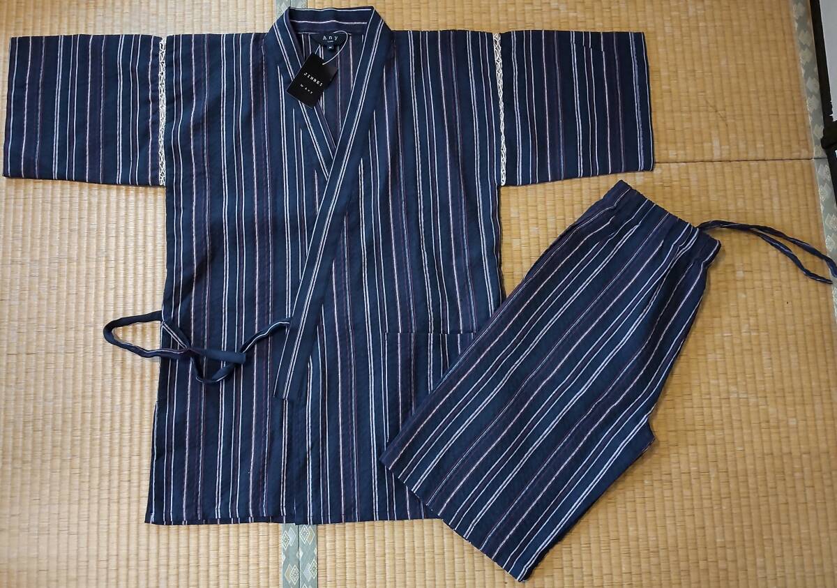 - 新品 甚平 上下セット Mサイズ 黒地に赤と白の縞 しじら織■送600