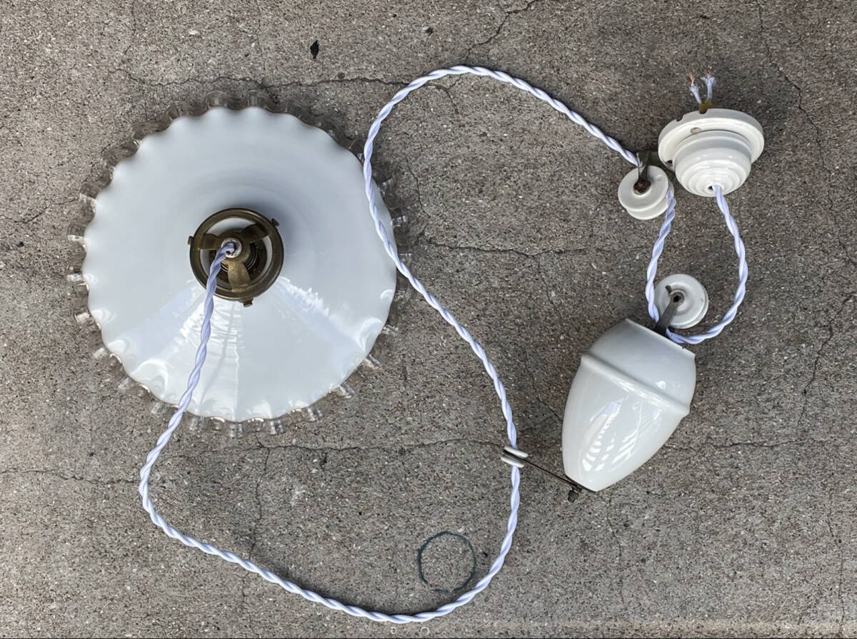 > 【merci】 2d. フランス 吊り下げ 滑車 ホワイトコード ランプ 古道具 店舗什器 アンティーク 古民家 ミルクガラス シェード