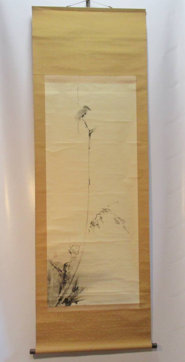 - 模写 工芸掛軸『宮本武蔵筆「枯木鳴鵙図」 軸先「木」』剣の達人 重要文化財 二天