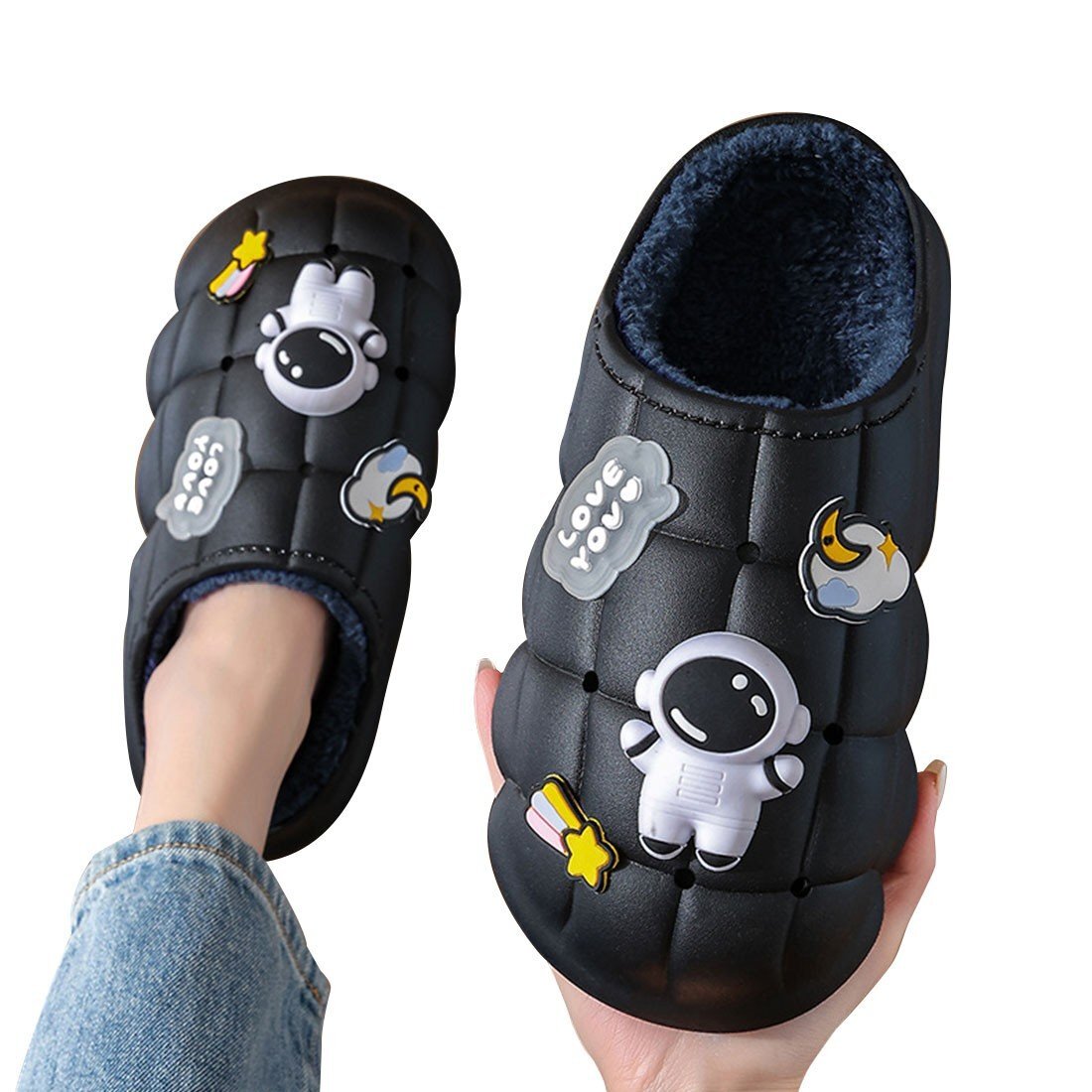 - チャーム付きスリッパ かかと無し 大人用 23.5cm ブラック レディース ボア付き 防水 裏ボア 防寒 防滑 厚底スリッパ