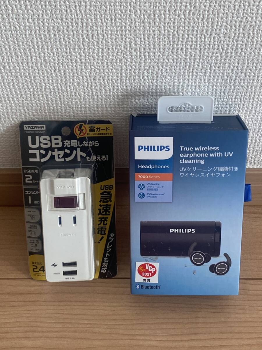 > ◆2 PHILIPS ワイヤレスイヤホン Bluetooth IPX5防水 急速充電 スポーツ タップ ブレーカー機能付き 直挿し USB2ポート+コンセント1個口