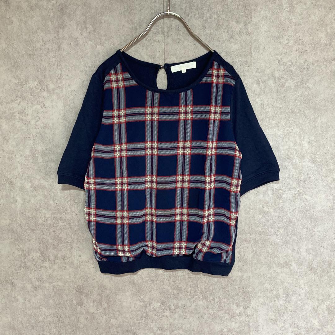 - 【grove】グローブ(M)チェック柄半袖カットソー*伸縮性*クルーネック*紺