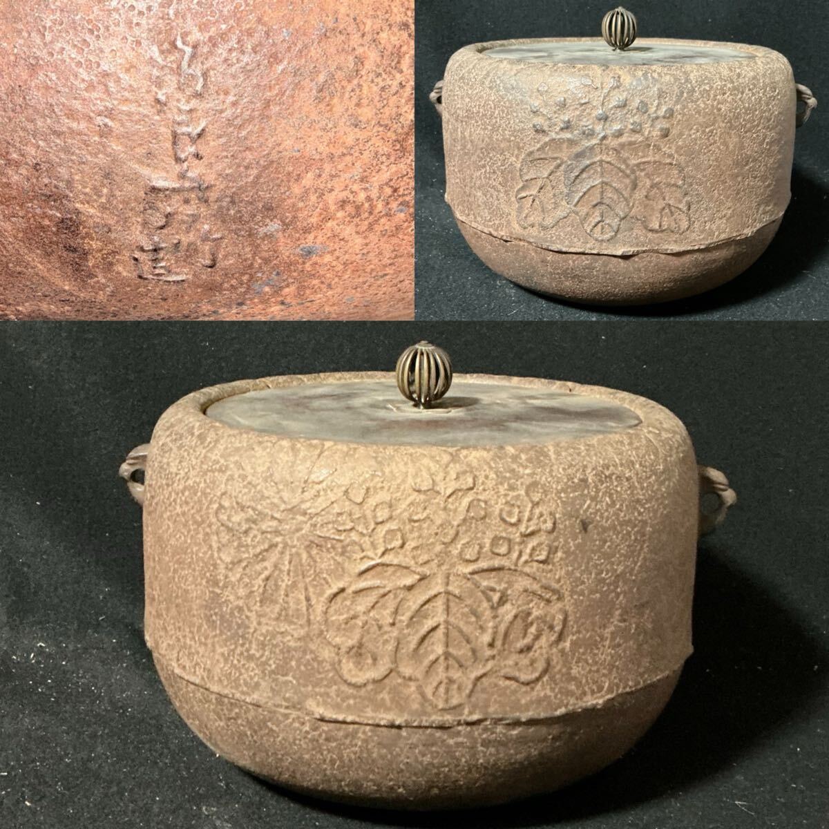 - 釜師 高木治郎兵衛 鉄製鉄製銅蓋釜 釜環 茶道具 五七桐紋 十六菊紋 茶釜 在銘