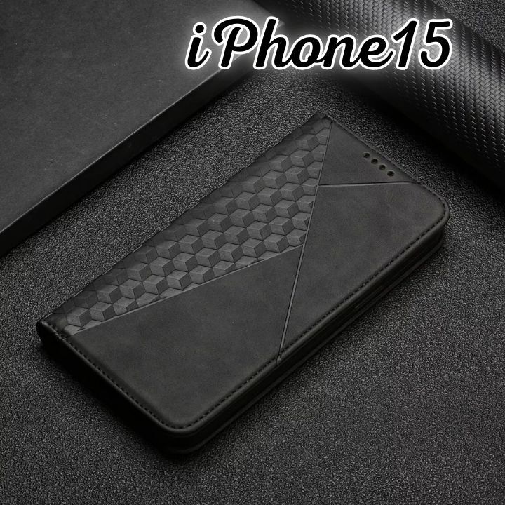 - iPhone15アイフォン 大人ブラック 手帳型ケース クレジットカード紙幣ポケット衝撃吸収