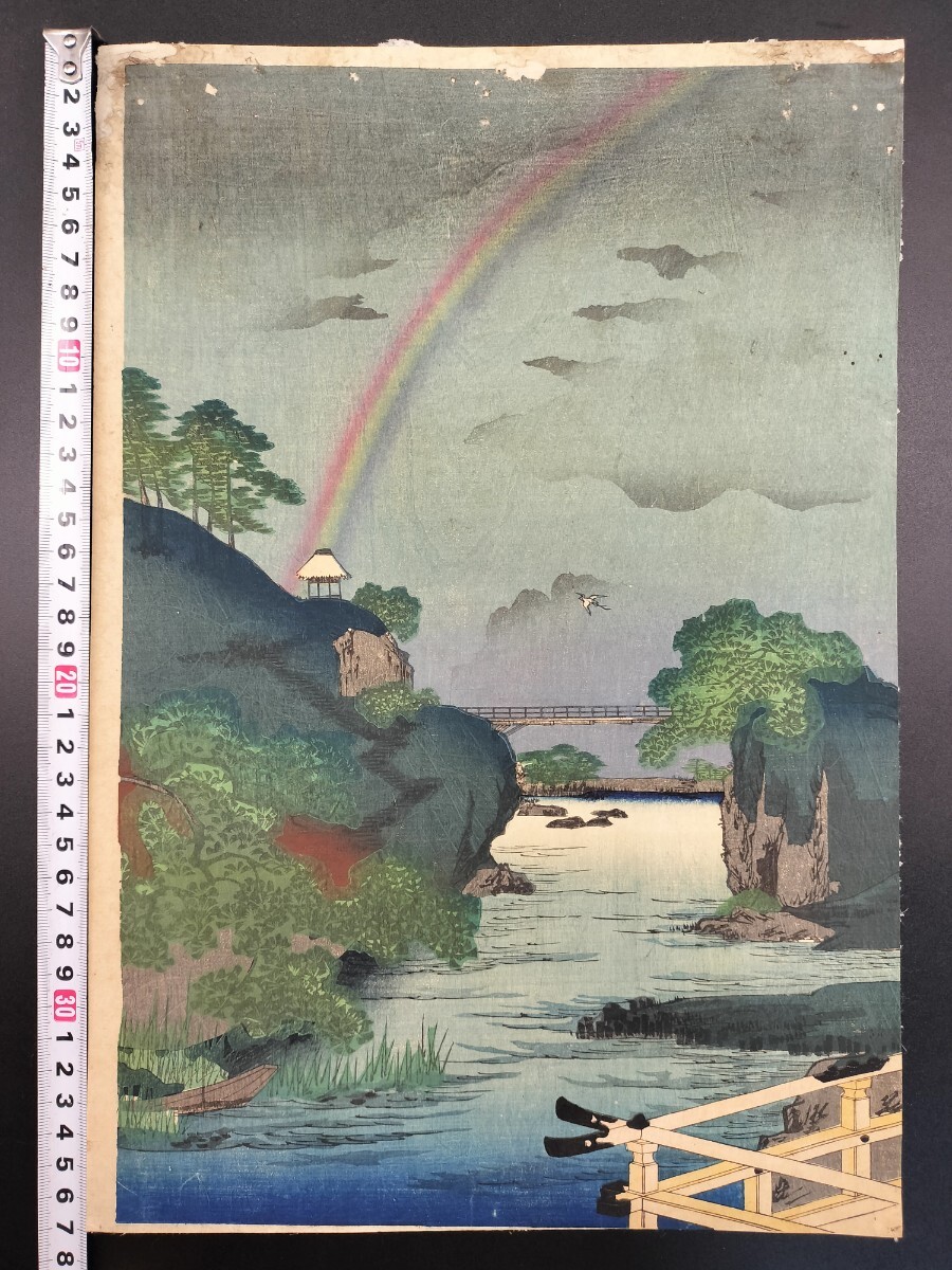 - 江戸期/真作「虹の図」本物浮世絵木版画 名所絵 錦絵 大判 裏打ち