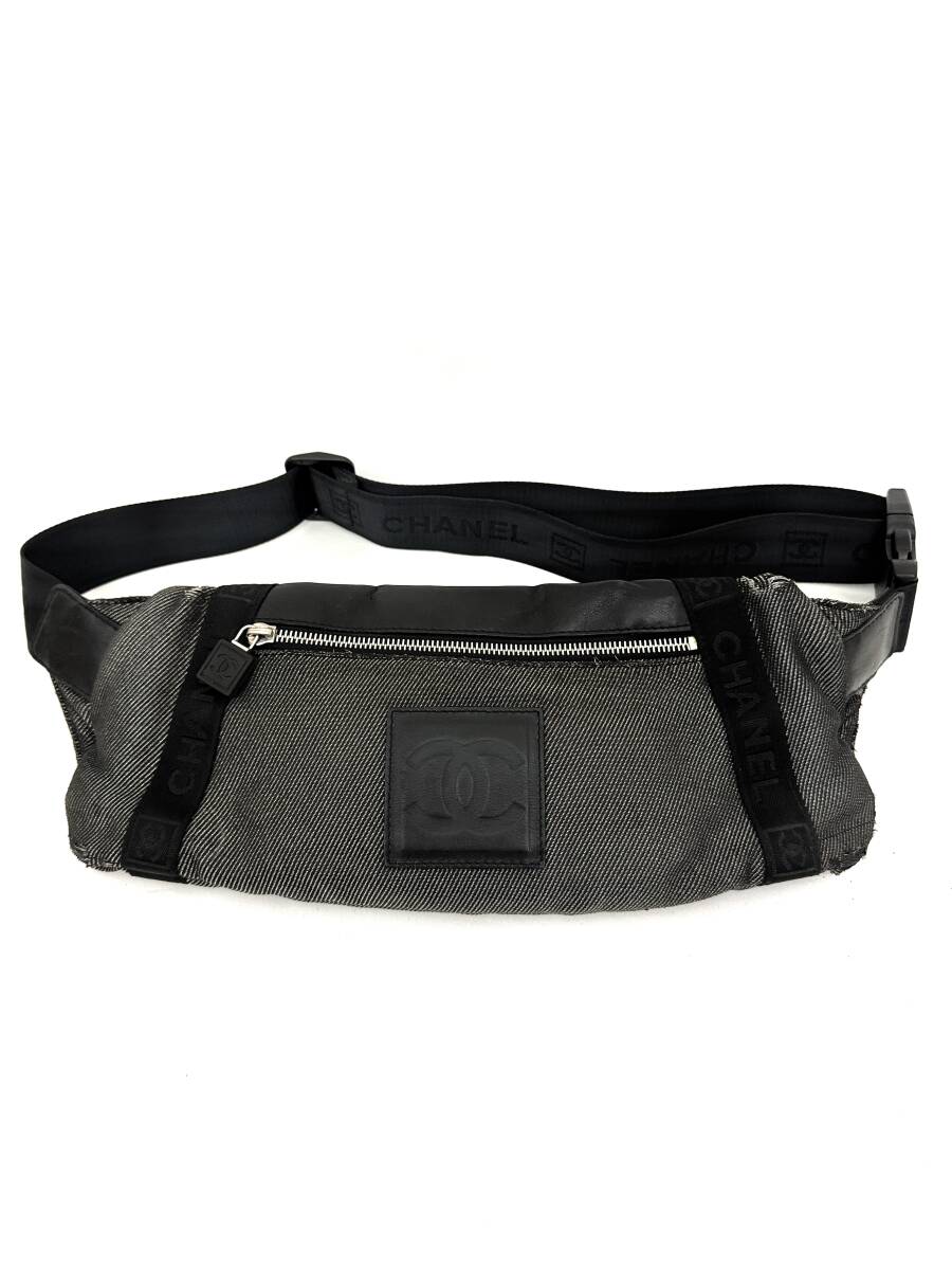 - 7I2102【本物保証】シャネル スポーツライン ウエストバッグ ウエストポーチ ココマーク ロゴ ブラック グレー キャンバス レザー CHANEL