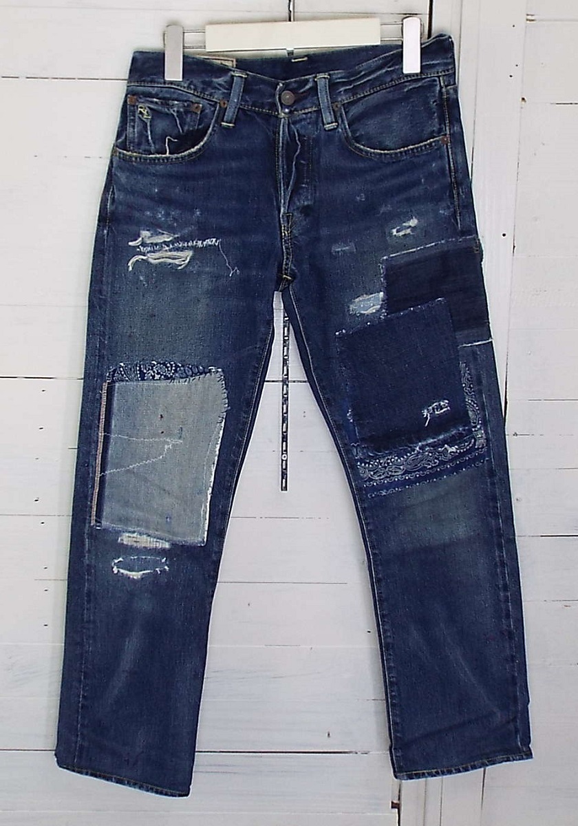 > T2633〇POLO RALPH LAUREN(ポロ ラルフローレン)ダメージ/リペア/加工 バンダナ スリム ストレート デニム ジーンズ W28