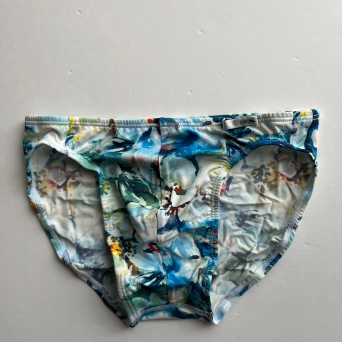 - HOM オム メンズビキニ S(XS) ホワイト/ブルー系 ナイロンストレッチ ビキニブリーフ メンズインナー メンズブリーフ 男性インナー