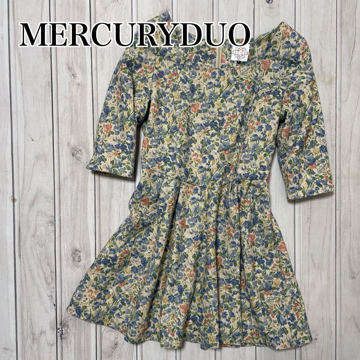 > MERCURYDUO マーキュリードゥオ 膝丈 ワンピース S M L フリーサイズ 花柄 柄物 背面ファスナー フラワー レトロ アイボリー 青 緑