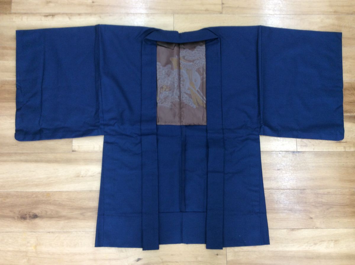 > 羽織 着物 青と緑 混合色 裏地に牛車 肩幅35cm 袖幅36cm 袖丈48.5cm 背縫い88cm 男性和装 陣羽織 はおり 織物 金彩 松 塵除け 管40029097