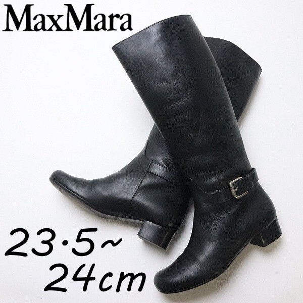 - 【HA409】◆Max Mara マックスマーラ レザー ベルトデザイン ローヒール ロング ブーツ 黒 ブラック 37 1/2