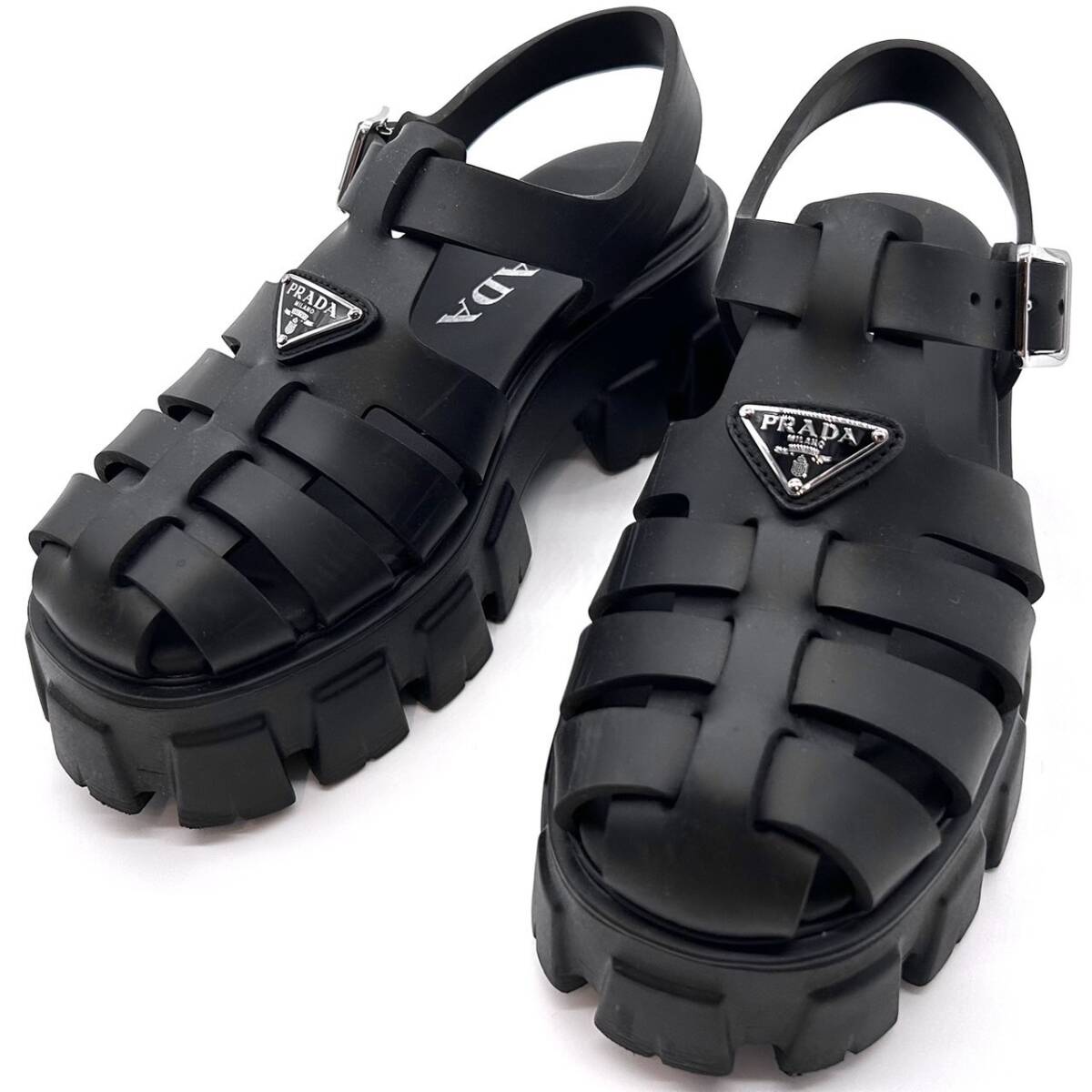- PRADA プラダ サンダル モノリス 22cm 厚底 三角プレート ブラック 黒 レディース