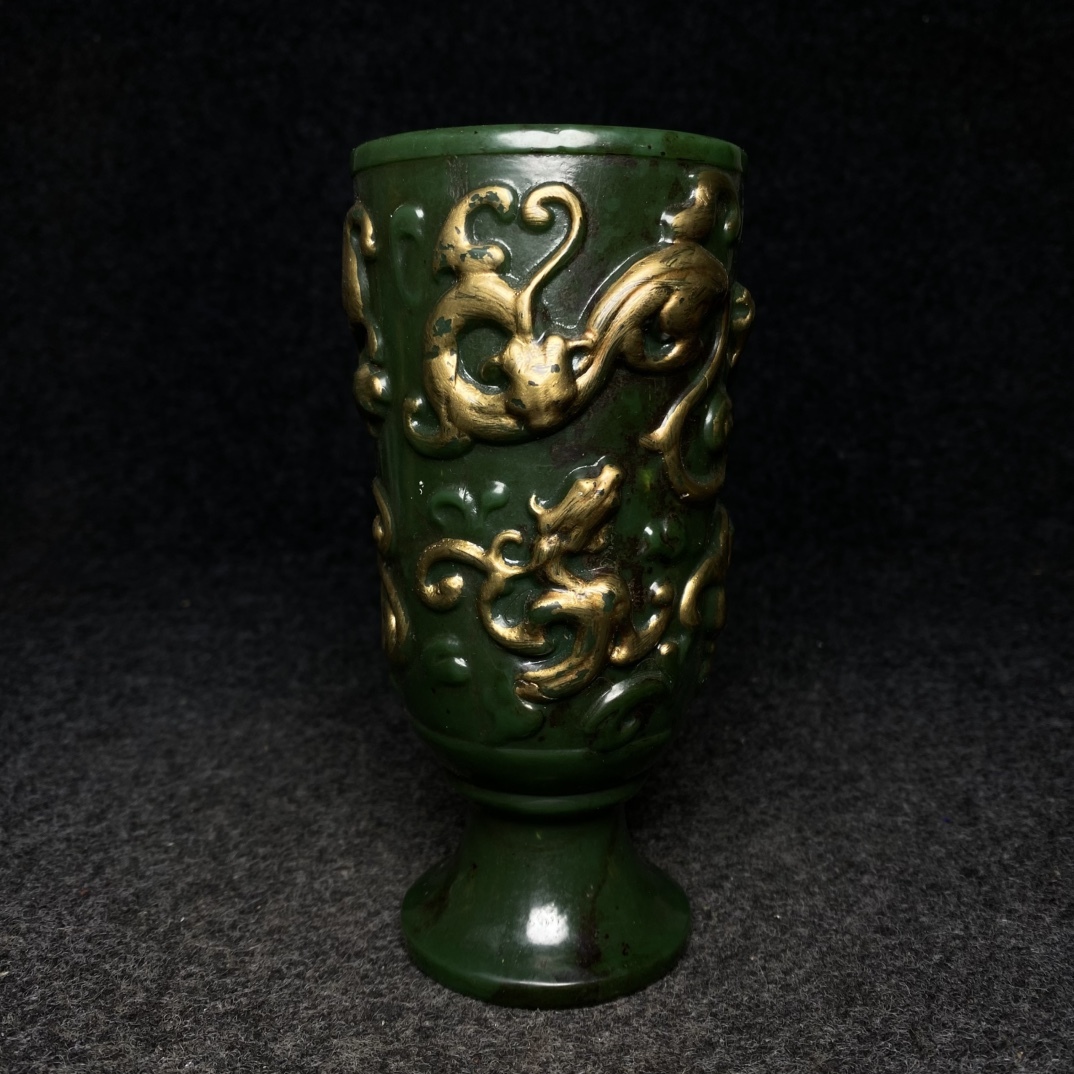 - 旧家蔵出し和田玉 高古玉細作 描金 神獣紋 爵杯 酒杯 酒器 供養品 極細工 置物 古美術品 旧家蔵出 旧家供養品