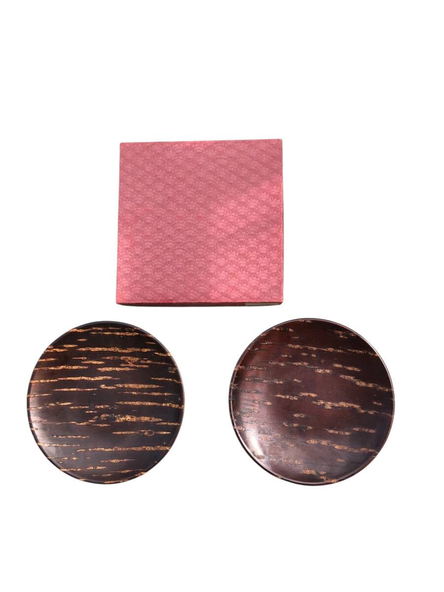 ・丸茶托 2枚 箱付き 昭和レトロ 天然木 煎茶道具 桜皮細工(?) 木製 菓子皿 茶道具 和食器 インテリア 和モダン 木工芸 中古