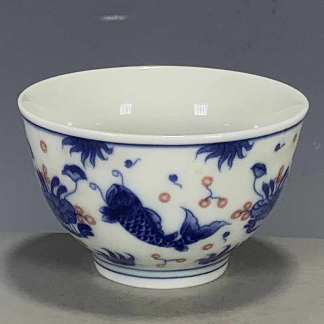 - 磁器 青花 明代 成化 サバ海藻魚紋 置物 主人杯 茶碗 装飾品 磁器 中国陶磁 収蔵品 中国美術品コレクション