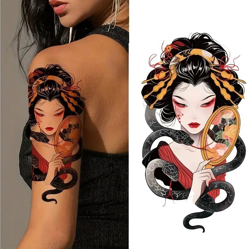 - 【タトゥーシール】★芸者 (2) 花魁 蛇 腕 和柄 耐久性あり 1枚 約 11.4cm×21cm リアル 和彫 TATOO