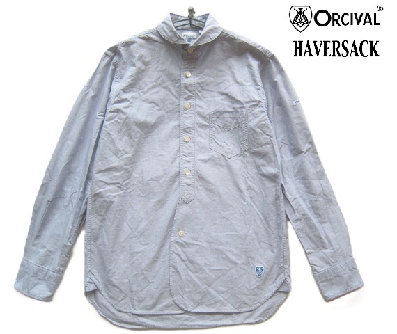 > 美品日本製!!ハバーサック HAVER SACK*ORCIVALダブルネーム 丸襟 チンスト付き シャツ 4 実寸M 紺×白 オーシバル オーチバル ワーク