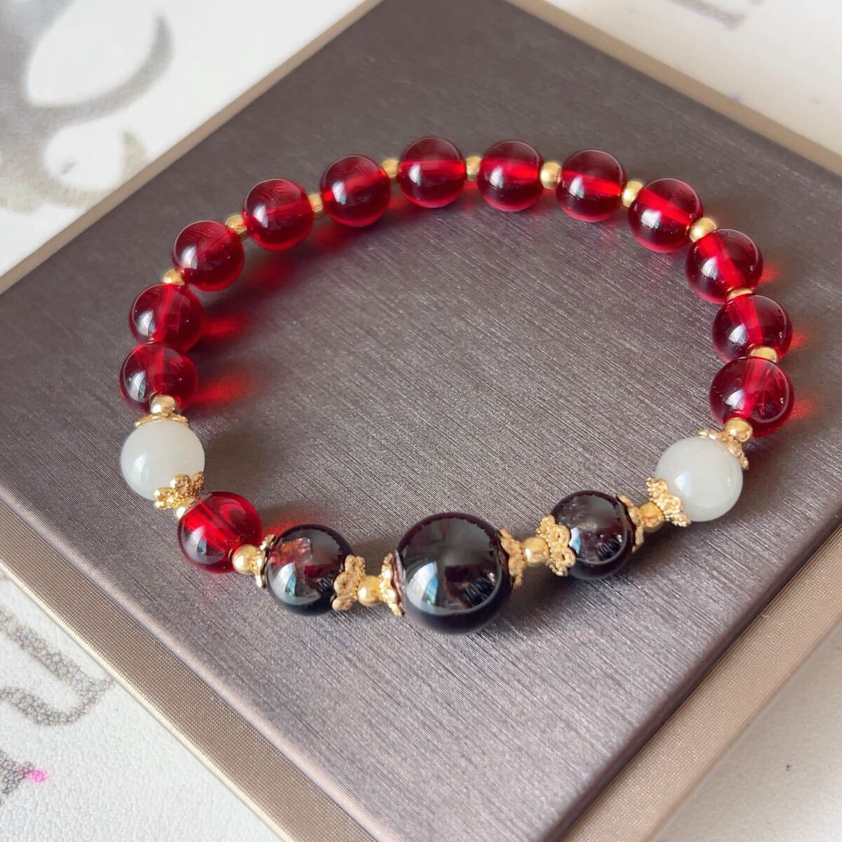 - 訳あり◇ガーネット(柘榴石)3粒(1粒スター入り)+金糸玉2粒◇ブレスレット◇パワーストーン◇天然石◇巾着袋付き◇プレゼントにも 023B9244