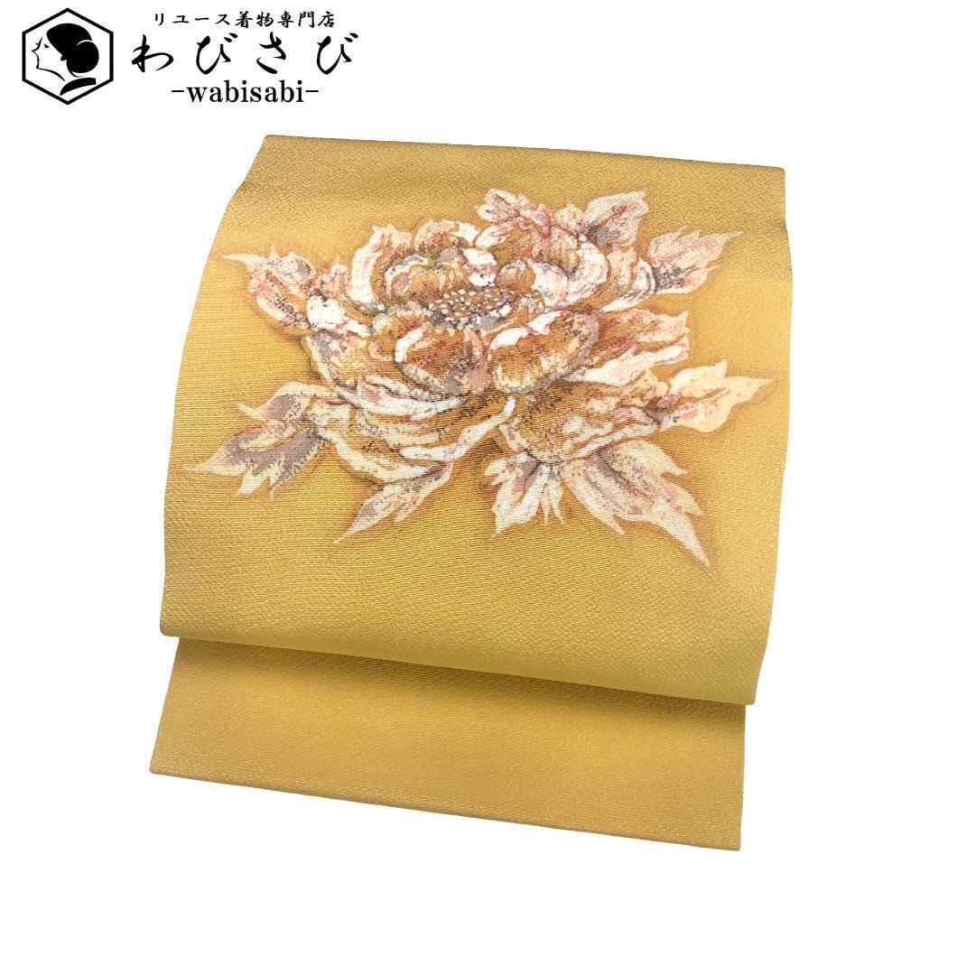 - 名古屋帯 花柄模様 縮緬 黄唐紙色 O-5492 着物 きもの kimono 和服 和装 中古 リサイクル着物 【送料無料】
