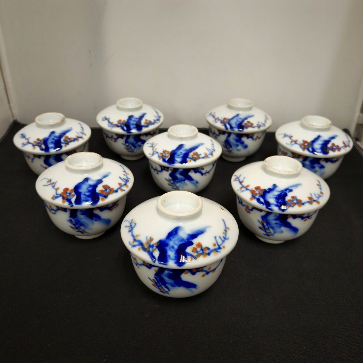 > 茶碗蒸し 陶器 大正~昭和初期物 染付 柿の図 蓋付き 小鉢 8客 染錦柿画 蓋茶碗 和食器 湯飲み 蓋物 (09257E