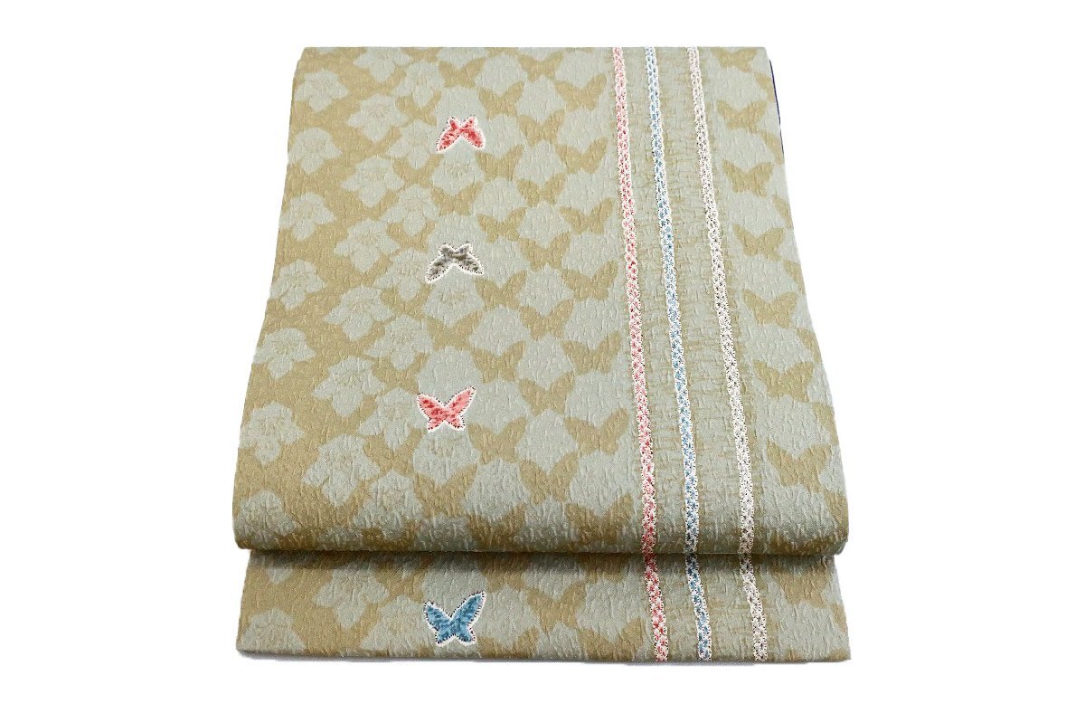 - 未使用品 名古屋帯 開き名古屋帯 グレージュ くすみブルー 長さ3m78cm お洒落 普段着 カジュアル 正絹 仕立て上がり 着物フィ m-8292