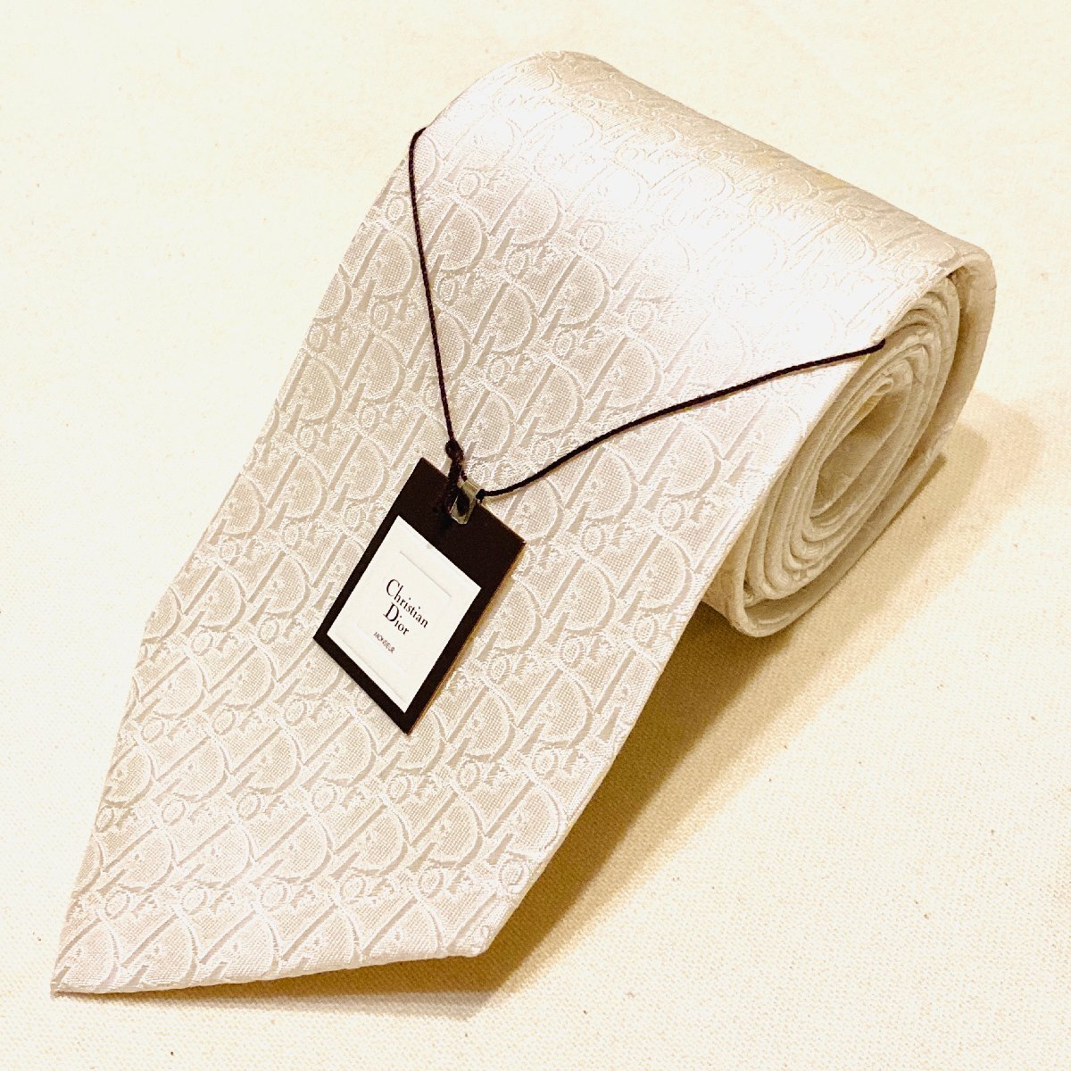 > 未使用 タグ付き Christian Dior MONSIEUR クリスチャンディオール 絹 シルク SILK 100% 高級 ネクタイ ホワイト ロゴ デザイン