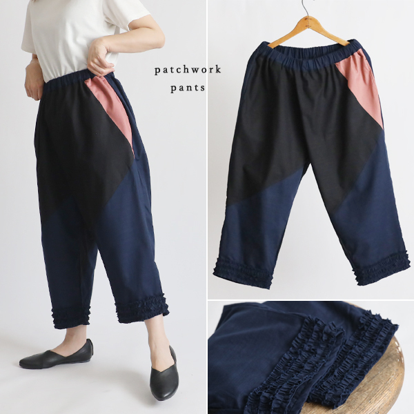 - 最終SALE 愉快なパンツ祭り 80cm ギマ擬麻コットン パッチワーク パンツ 小花フリル裾 斜めクロス ペチ Y41D