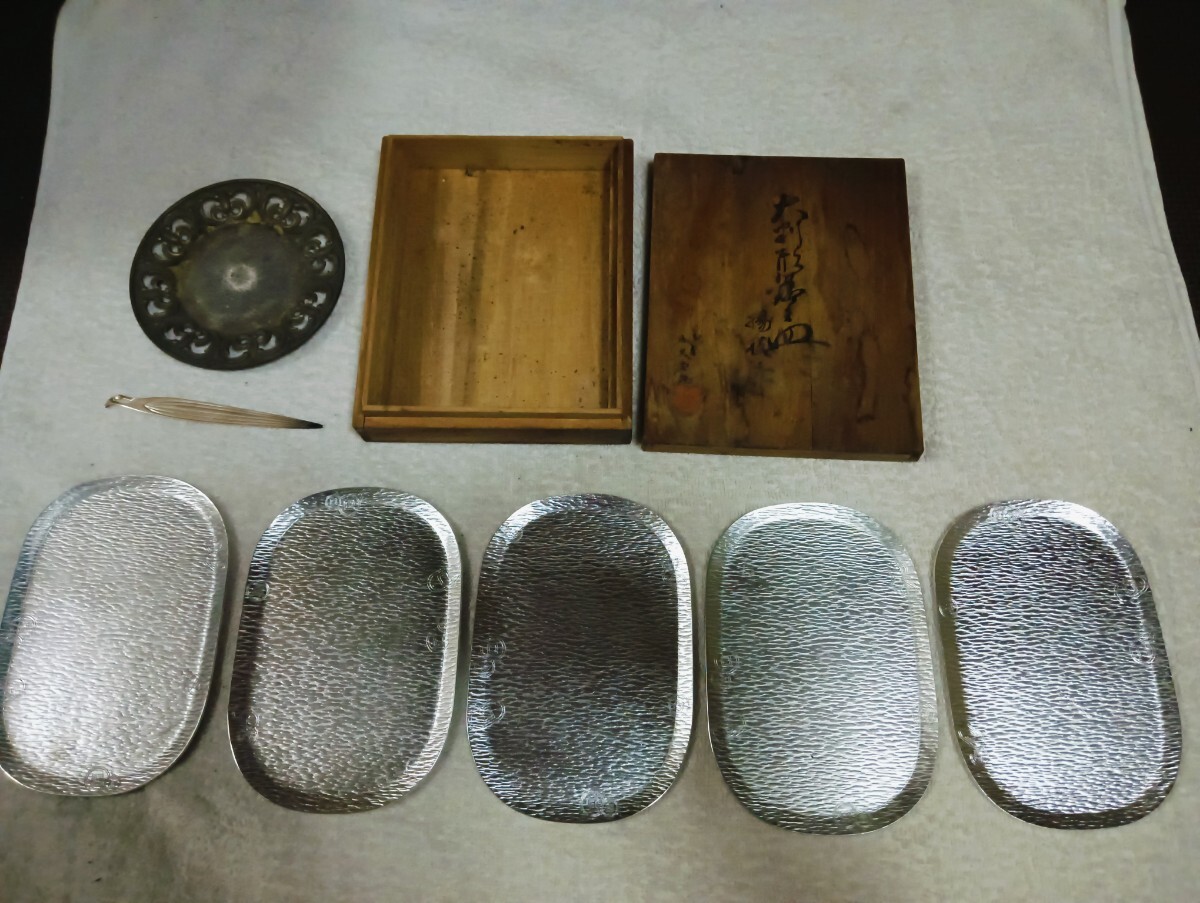 - 【時代逸品】尚美堂造 洋白/洋銀刻印 小判形 煎茶托 五客揃い 茶道具 共箱附 金属工芸 60サイズ