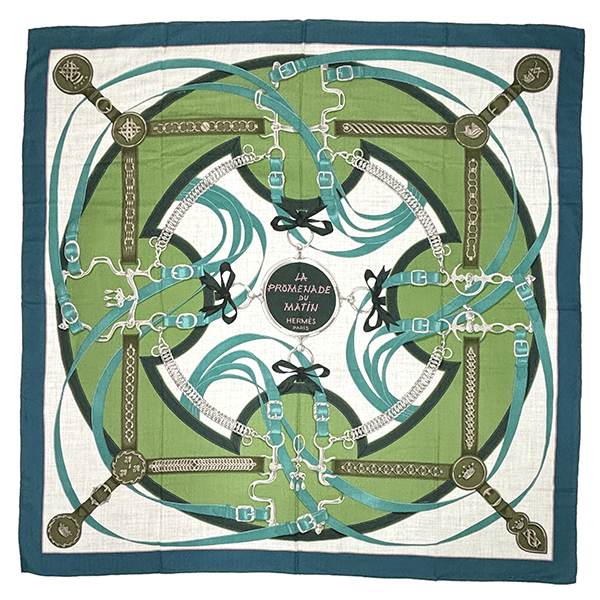 - エルメス カレジェアン 140 ショール スカーフ 朝の散歩 グリーン グレー 4091