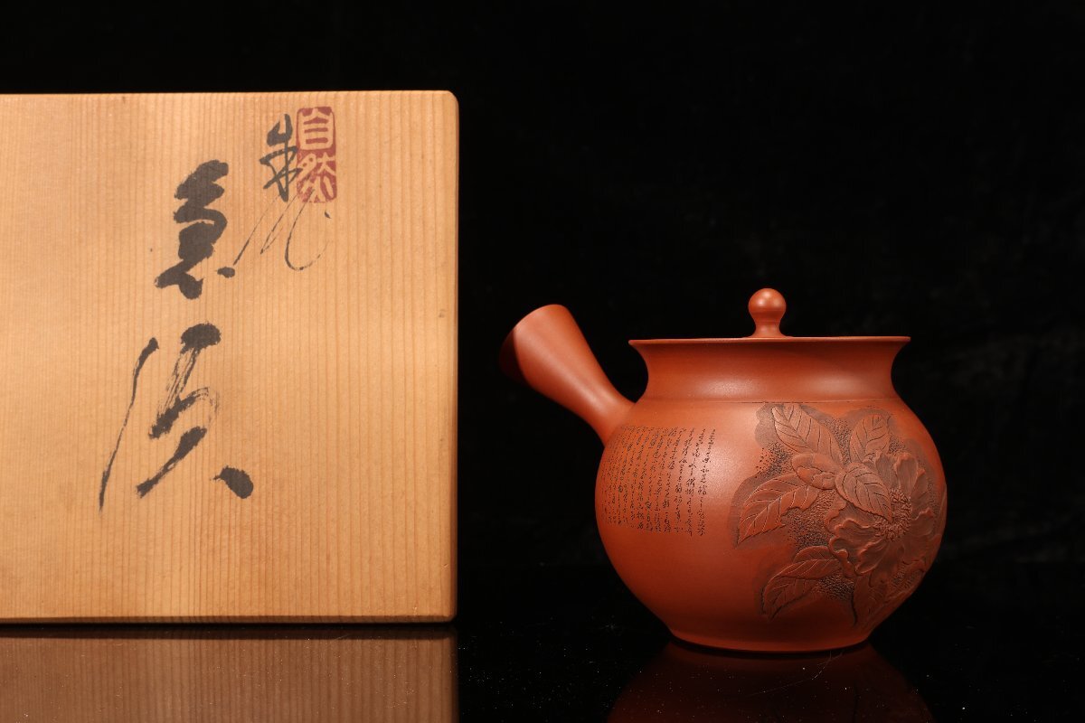 > 【珍品堂】1円から W03-V40 常滑焼 沢田昭邨作 名作 茶道具 花彫 急須 手描き 彫刻 古美術 骨董品 長13cm 幅10.5cm 高8.5cm