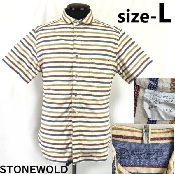 - 日本製★ストンウォルド/STONEWOLD★マルチカラー/ボーダー柄/半袖シャツ【メンズL/ベージュ×青×赤】Tops/Shirts◆BH718