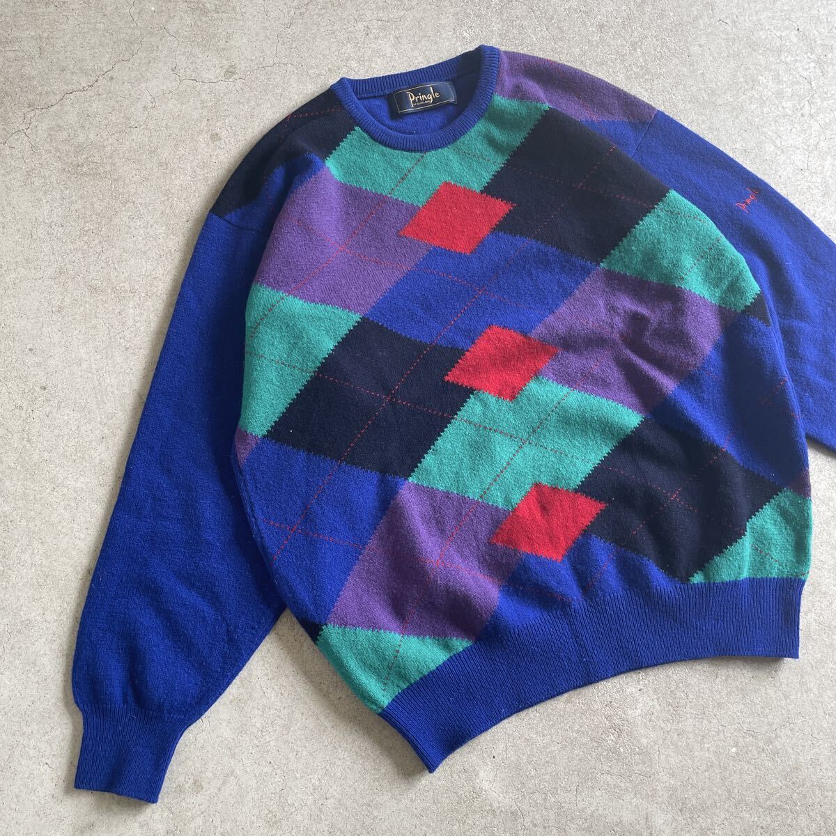 > pringle スコットランド製 ウール100 アーガイル ニット セーター クルーネック 5プリングル 古着 メンズ レディース L 英国製 ハイゲージ