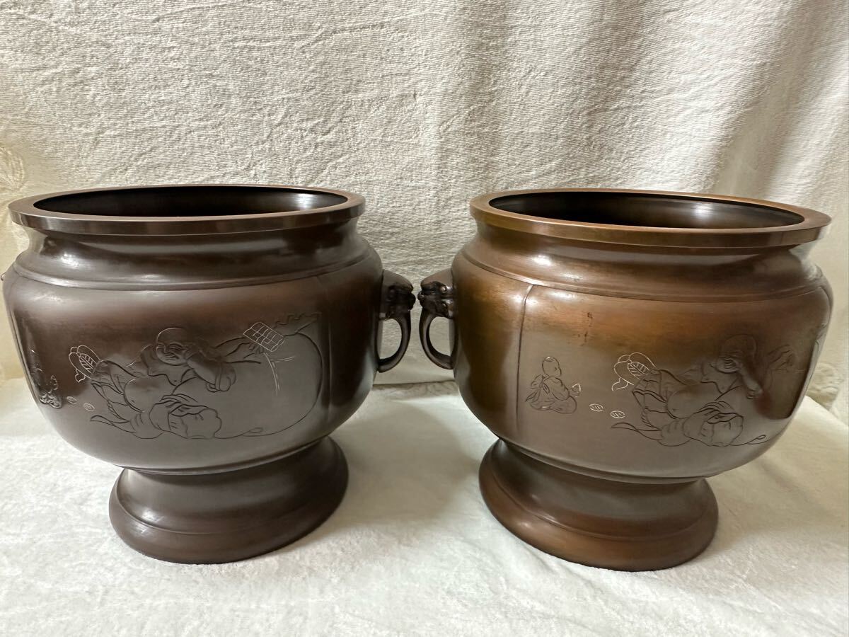 - 銅 真鍮製 布袋図象嵌 火鉢 一対 古道具