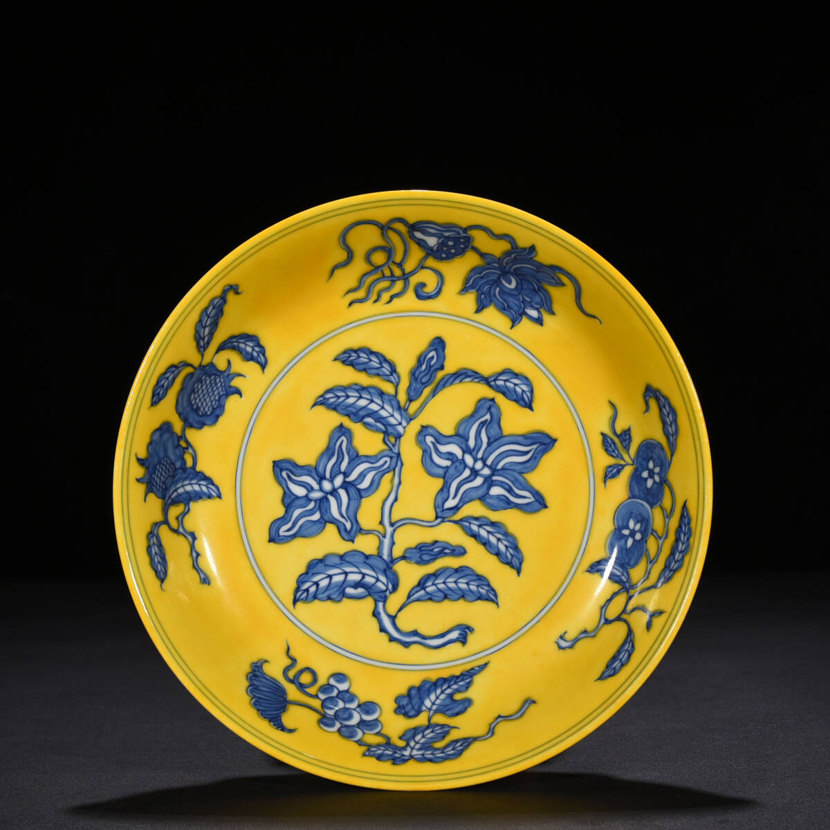 > 明時代 弘治 嬌黄釉 青花 染付 花卉文盤 唐物 箱付き 陶磁器 中国美術 古美術 置物 骨董品 H52