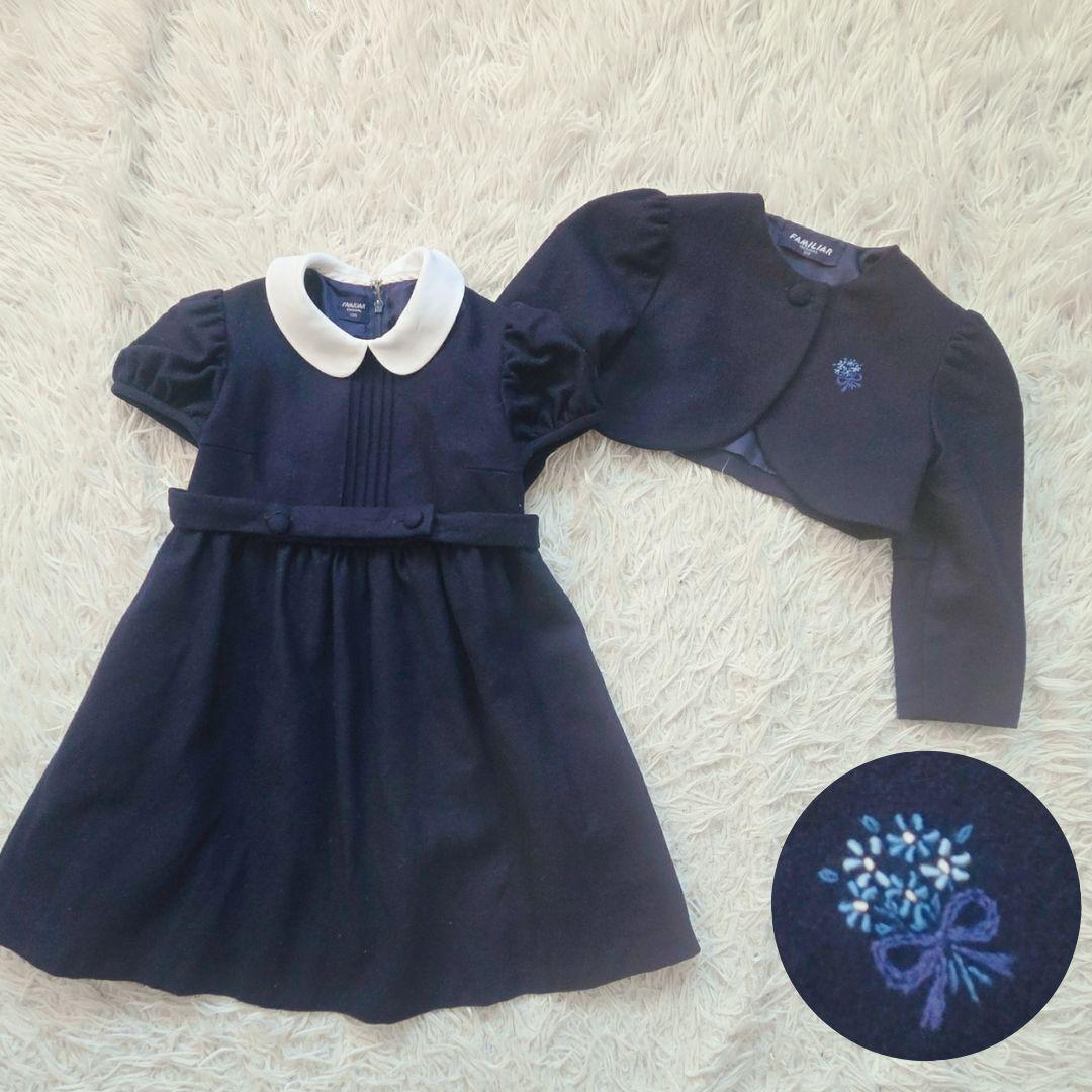 - ファミリア セットアップ ワンピース ボレロ お受験 花刺繍 白襟 フォーマル 100cm