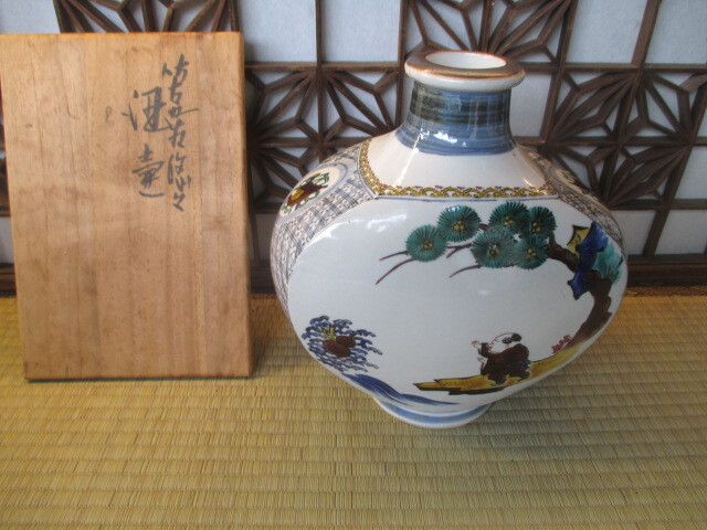 - 《和》 九谷焼 酒壺 色絵壺 布袋の図 五十吉 花器 置物 共箱