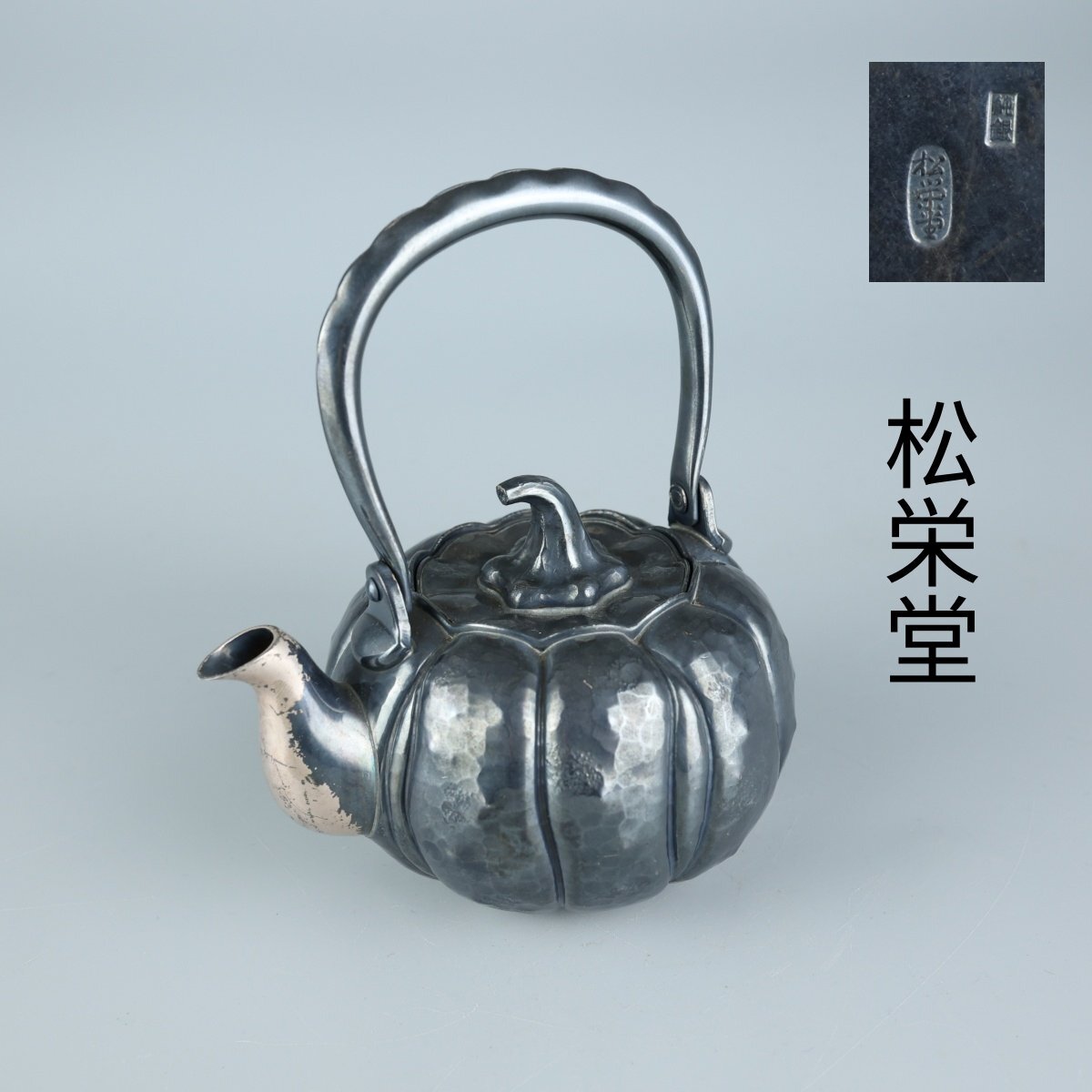 - 【志】K0799 小振銀瓶 松栄堂造 純銀 南瓜形燗瓶 鎚目 茶道具 酒器 提梁壺 湯沸 重量354g 容量300ml