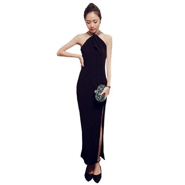 - ナイトドレス ノースリーブ ハイスリット ロング丈 ストレッチ ハイネック ボディコン レディース ブラック S
