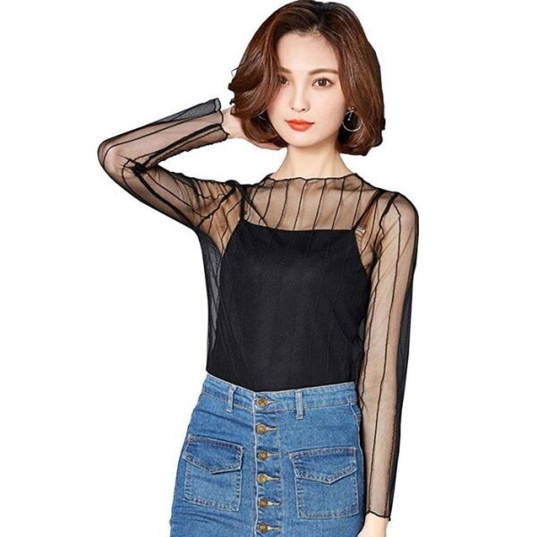 - トップス シースルー 長袖 総レース ハイネック レディース 透け透け ブラウス お洒落 フリーサイズ ストライプ柄 ブラック
