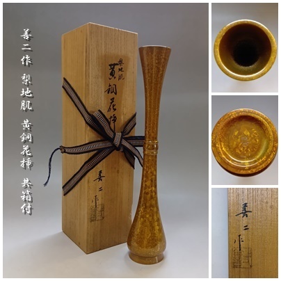 - 【T-482】善二作 梨地肌 黄銅花挿 花入 共箱付 茶道具