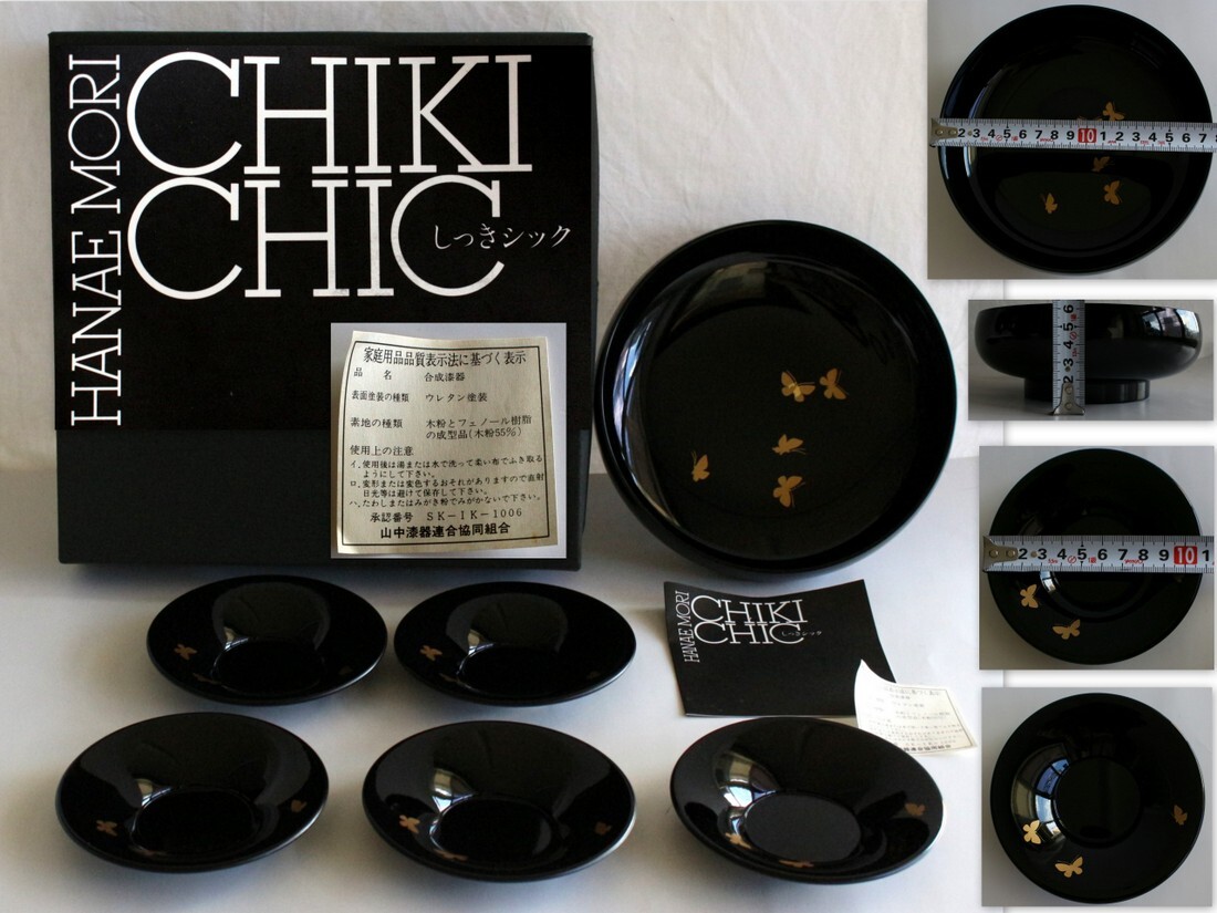 > 1477/中古/森英恵 しっきシック 菓子器と茶托-5枚 ※HANAE MORI ハナエモリ CHIKI CHIC 黒 漆器 蝶々 金彩
