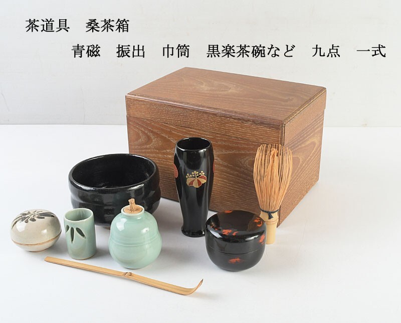 - 茶道具 桑茶箱 青磁 振出 巾筒 黒楽茶碗など 九点 一式 MHZA