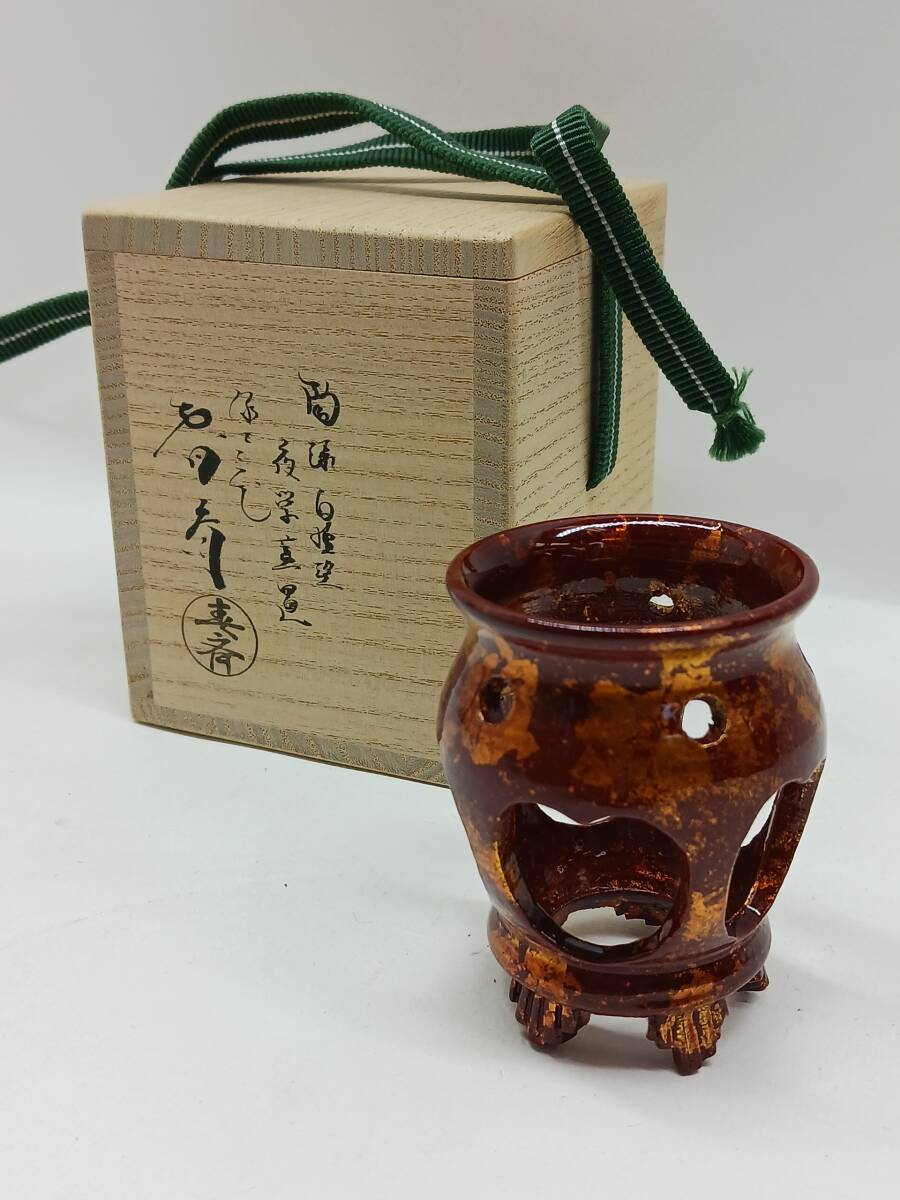 - 【骨董茶道具】陶漆 白檀塗 夜学蓋置 前畑春斎作 茶道具 茶器 共箱 共布 経歴付き 箱書無 年代不明 細工装飾 コレクション 骨董(は)